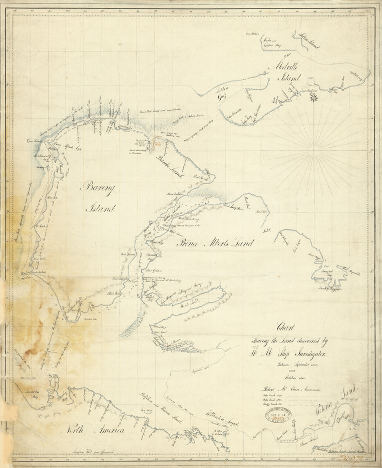 The most complete of its kind, this survey depicts the tracks of HMS Investigator, under the command of Robert McClure, between 1850 and 1851 during its search for John Franklin’s ill-fated expedition to the Arctic. HMS Investigator had originally set out with HMS Enterprise under Captain Collinson, but they became separated off the coast of Chile. McClure, who had already visited the Arctic with George Back in 1836-7 and Sir James Clark Ross in 1848-9, continued north and the ships did not meet again on their expedition.