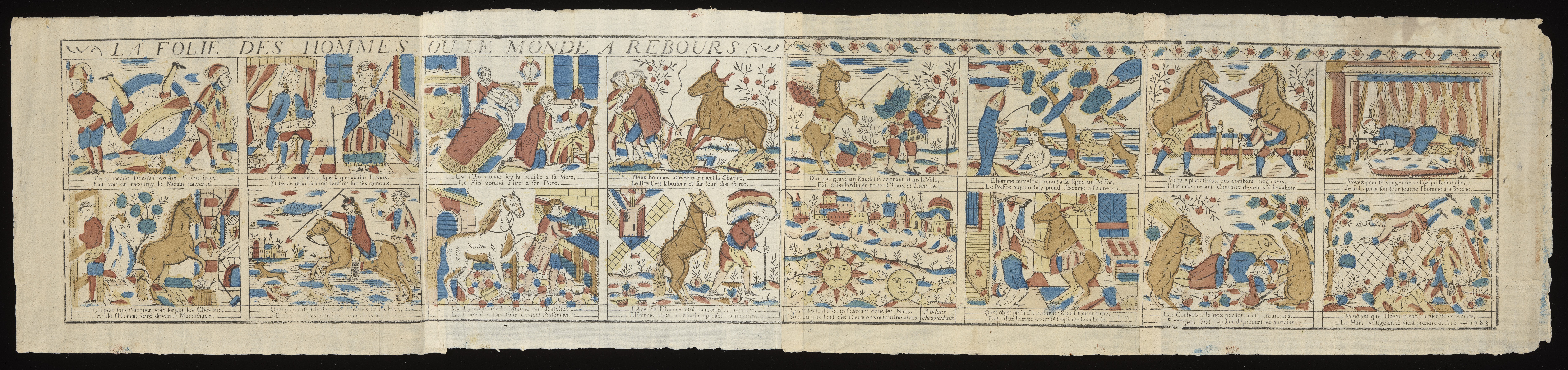 this uniquely surviving example of large format colour printing from pre-Revolutionary France. It comprises a composite sheet of paper almost 1.5 metres long, woodblock printed in four sections and pasted together. The images are charmingly simple, using four colours stencilled over a line drawing with captions explaining the scenes in rhyming couplets explaining the scenes. Pierre Perdoux was one of the leading printers of decorated papers in Orléans, with the majority of his surviving works being smaller format items on religious subjects, and some 500 examples of papiers dominotés. Only a handful of these oversized prints are preserved.