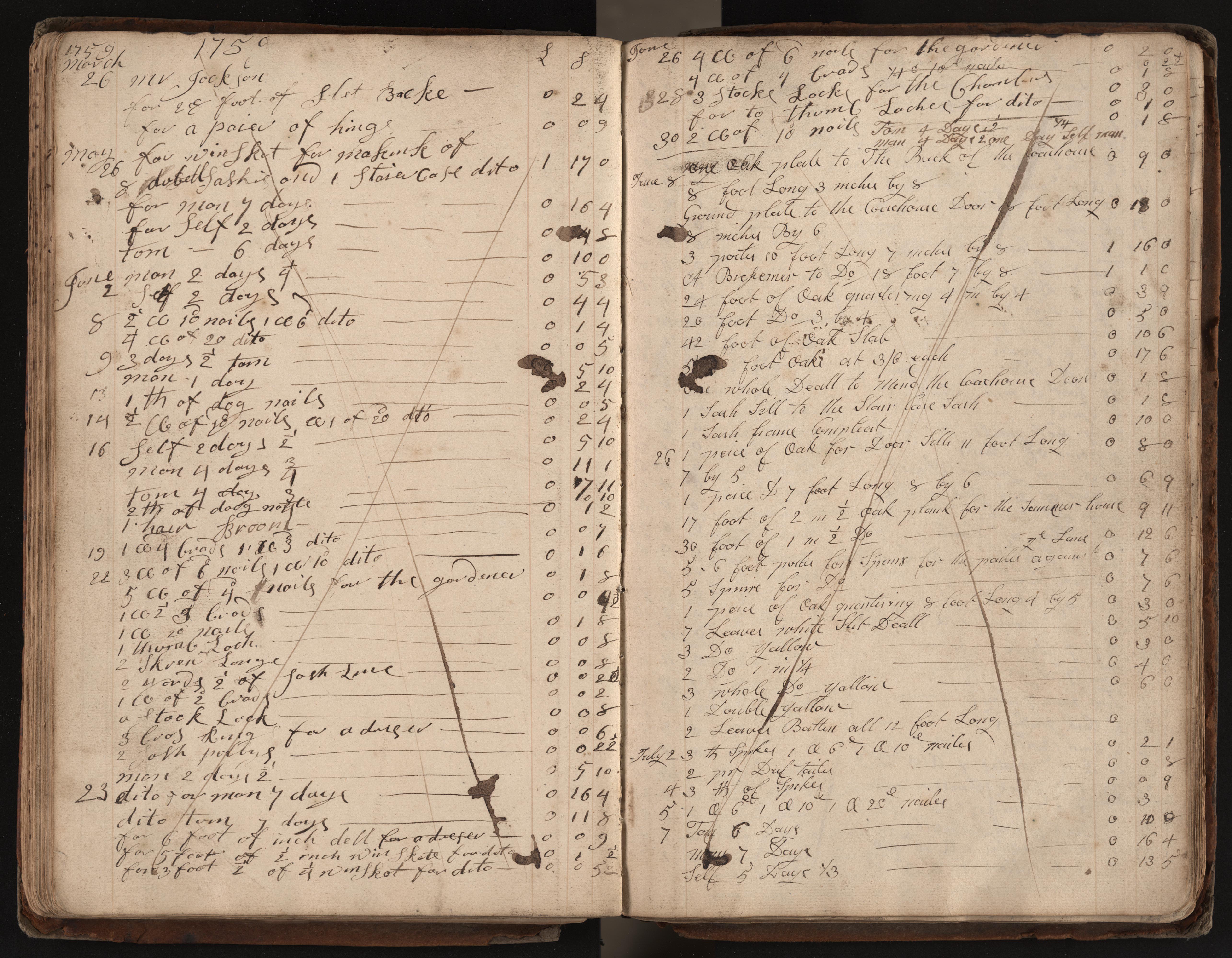 This volume provides a fascinating insight into domestic and material culture in the 18th century with reference to payments for linen and furniture alongside the purchase of crops and other good such as coal, straw, and apples. References are made to taxes (‘…for one years Window Tax £01-00-00’) and to disbursements made by Pilbeam in his role as Churchwarden (‘2 Church lockes’ and ‘wine for the communion’).