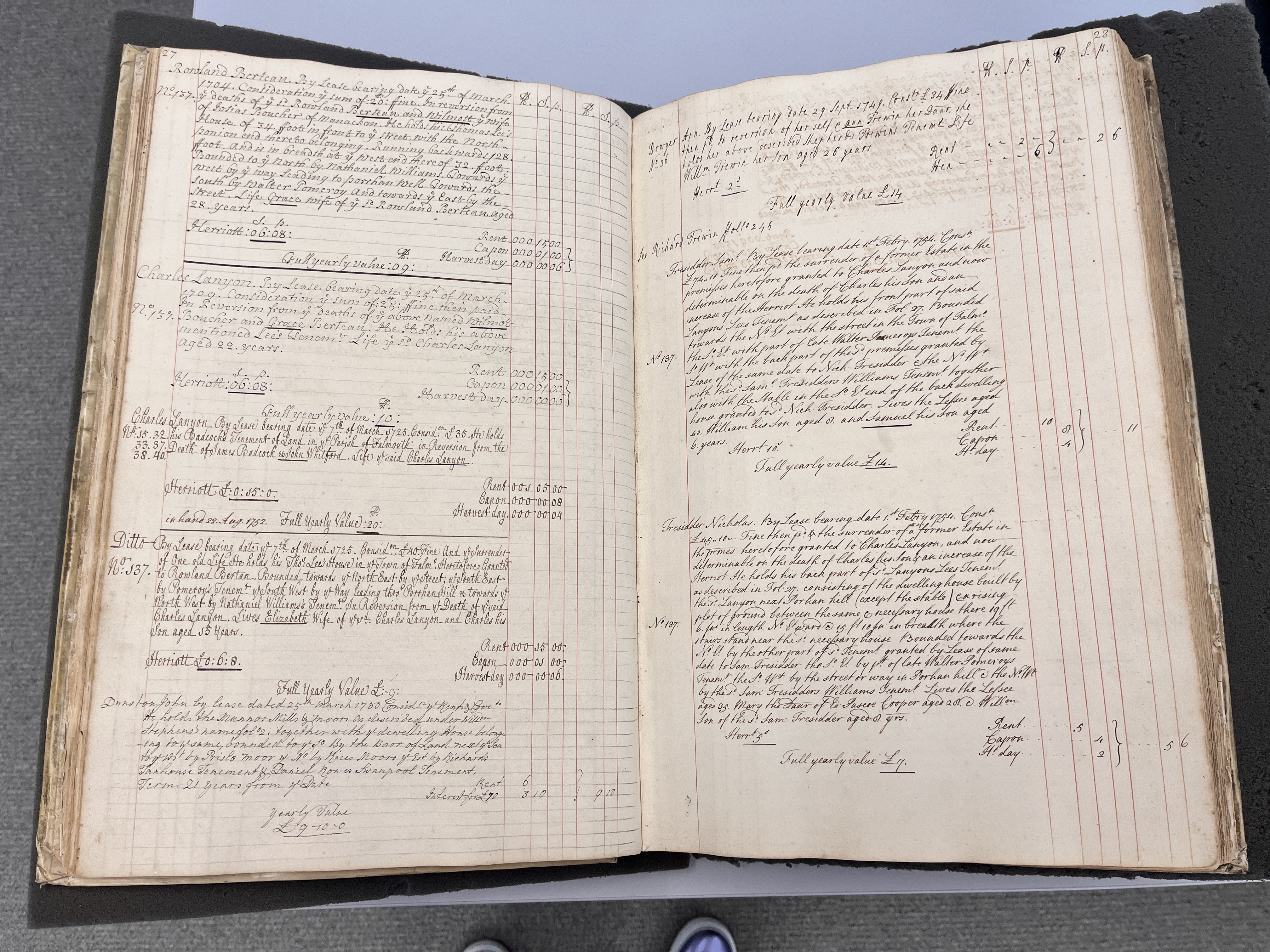 The archive consisted of a very large vellum bound ledger of leases, dated 1648 on its front cover, as well as a similar volume commencing in 1786. In addition, there was a mid-18th century survey book for the manors of Arwenack, Mylor, Tregenvor, Trevethan, Trescobeas, Prisla and Treganiggey. Other records include 25 letters from the 1730s from Martin Killigrew to a Mr Hall, three undated lists of Falmouth houses, a manor of Arwenack field book for 1820-1821, a report for new buildings and improvements at Falmouth in 1812-1826 and seven rentals from 1877-1899.