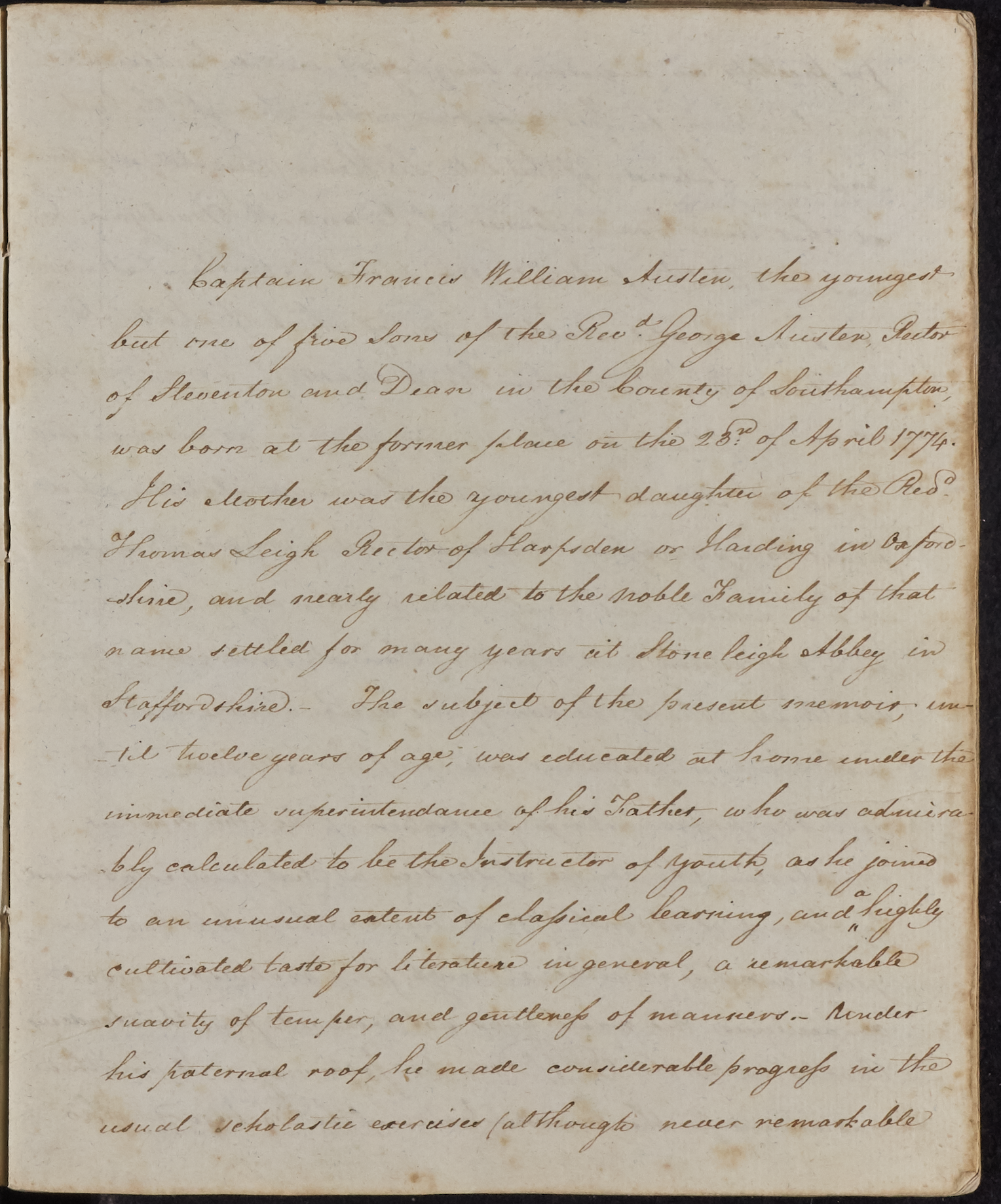 These objects are significant additions to the Jane Austen House collection, offering new insights into Jane Austen and her family and new avenues for research. The biography (dated c.1863) is written in the third person but is likely Francis Austen’s own account, describing his life and family relations as well as observations on historical events within his knowledge and impressions of the countries he visited. The album contains 73 topographical watercolours and drawings, mainly of the West Indies and Canada, made by Francis Austen and his daughter Cassandra Eliza Austen in the 1840s.