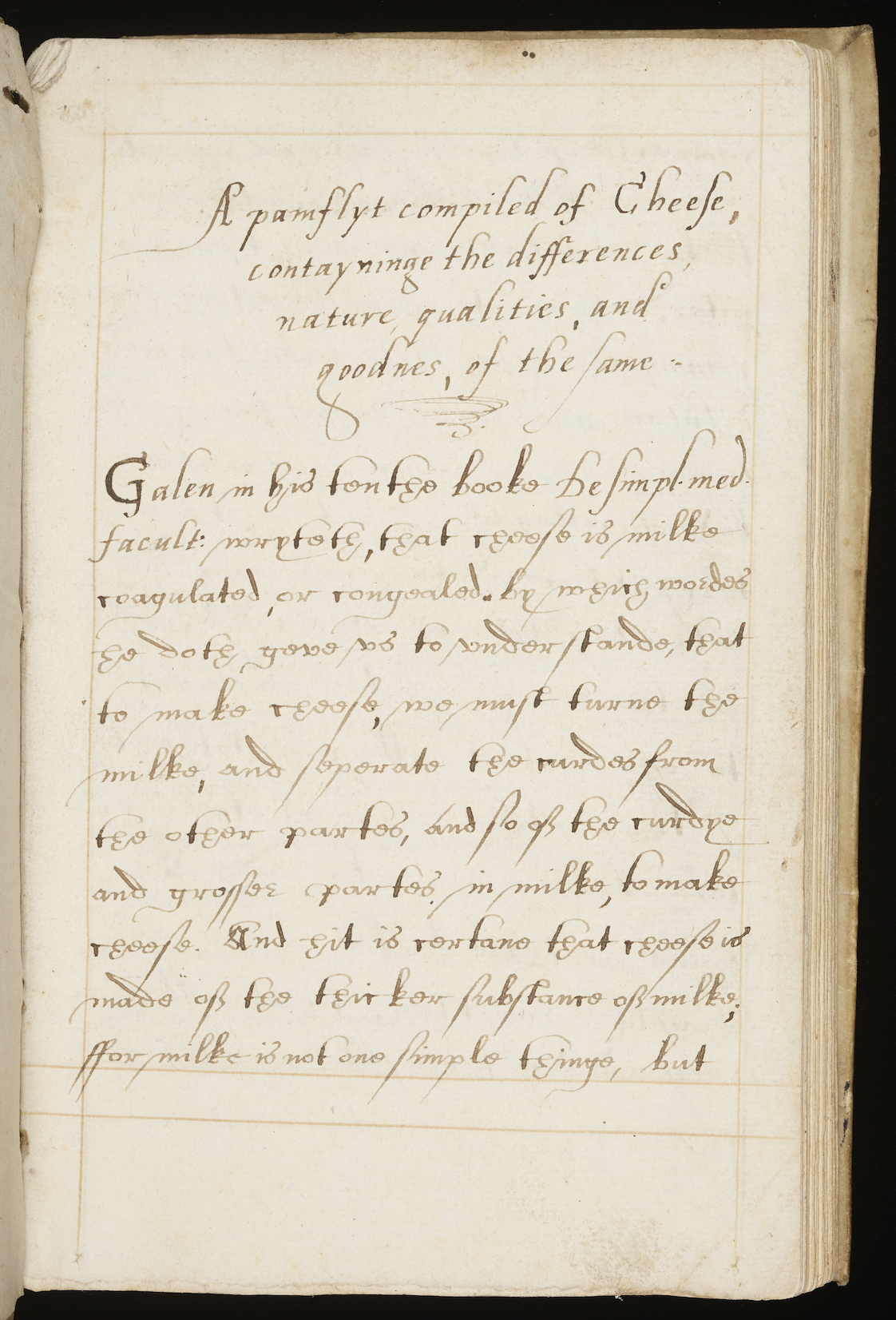 Unknown and thought to be unpublished, this vellum-bound manuscript was written probably around the 1580s. The manuscript, in Secretary hand, is probably the first comprehensive academic study of a single foodstuff to be written in the English language, which gives it particular significance for food historians. The ‘Pamflyt’ follows typical Elizabethan practice of collecting all available information from Classical authors such as Galen and Virgil - it opens with the Greek philosopher-physician Galen’s broad definition of cheese as ‘milke coagulated, or congealed’ - as well as the Persian philosopher-physician Abu Bakr al-Razi, and contemporary physicians at the University of Salerno. There is also a section on ‘the vertues of cheese used as a medicine’, with the effects of cheese on people of different temperaments based on the theories of the bodily humours put forward by Galen and his predecessors. To gain practical information, the author then went on to ‘diligently inquire of country folke, who gave their experience in theis matters.’