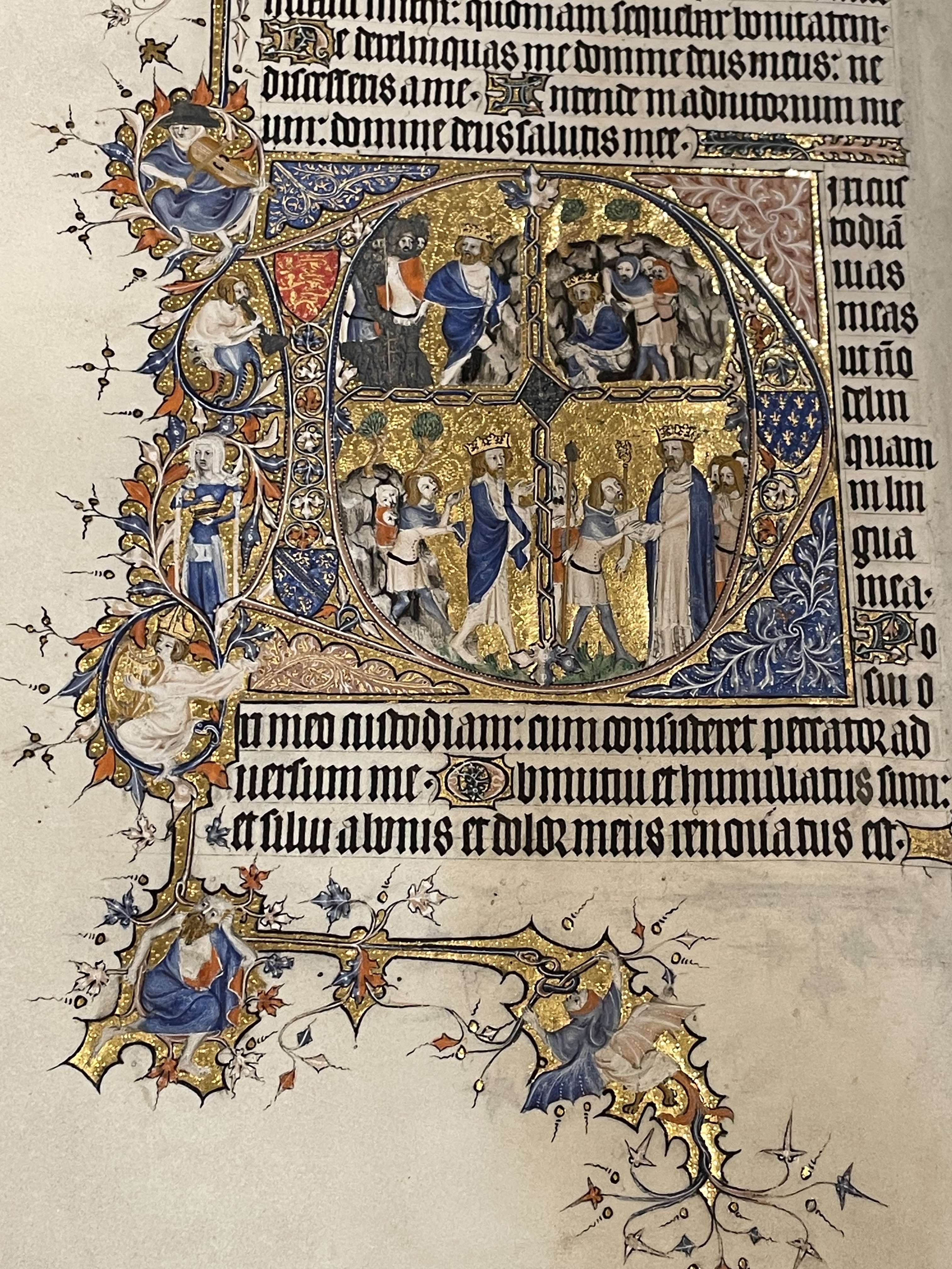 The manuscript contains a Psalter and Book of Hours and was made for a member of the de Bohun family. The decoration is of a very high quality comprising historiated initials and decorated borders, indicative that this was a de luxe production. It is likely that this volume was commissioned by either Humphrey de Bohun (either the 6th or 7th Earl of Hertford) or for Mary de Bohun (d.1394).