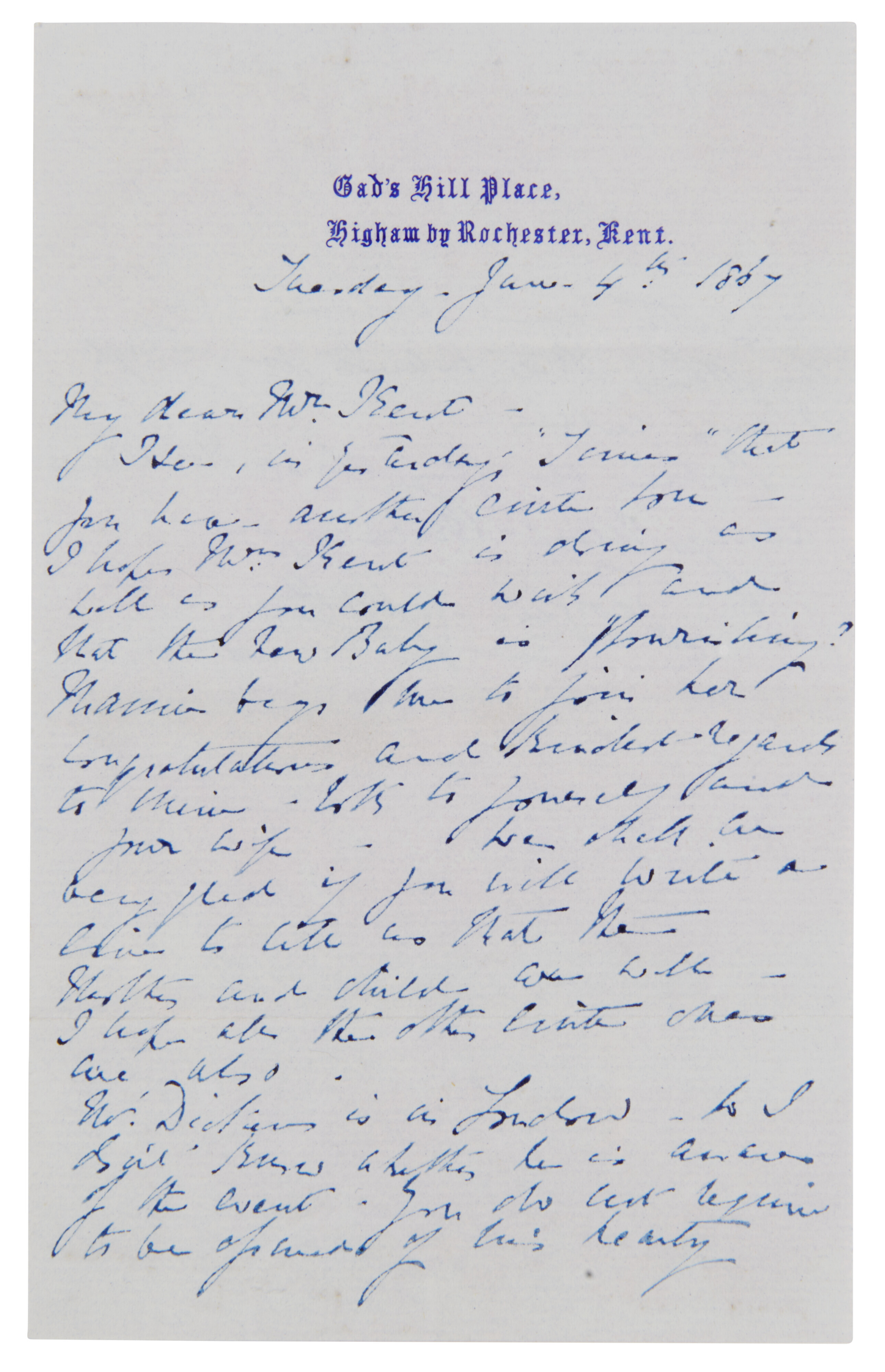 Charles Kent (1823-1902), the recipient of these letters, is also of significance for the Museum due to his lengthy friendship with both Charles Dickens and Georgina Hogarth. Kent was an English poet, biographer and journalist who became editor of The Sun newspaper and contributed to Dickens’s weekly magazines, Household Words and All the Year Round. As this acquisition reveals, Kent and Georgina began writing to each other while Dickens was still alive, and were later able to share their profound grief on his sudden death, as well as discuss their subsequent efforts to preserve Dickens’s reputation and promote his work.