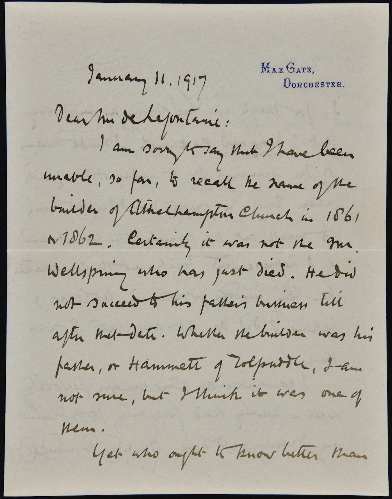 Letter from Thomas Hardy to Alfred de Lafontaine of Athelhampton House